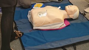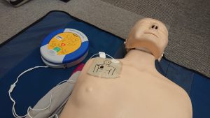 機器の使い方、心臓マッサージの練習を行っています。